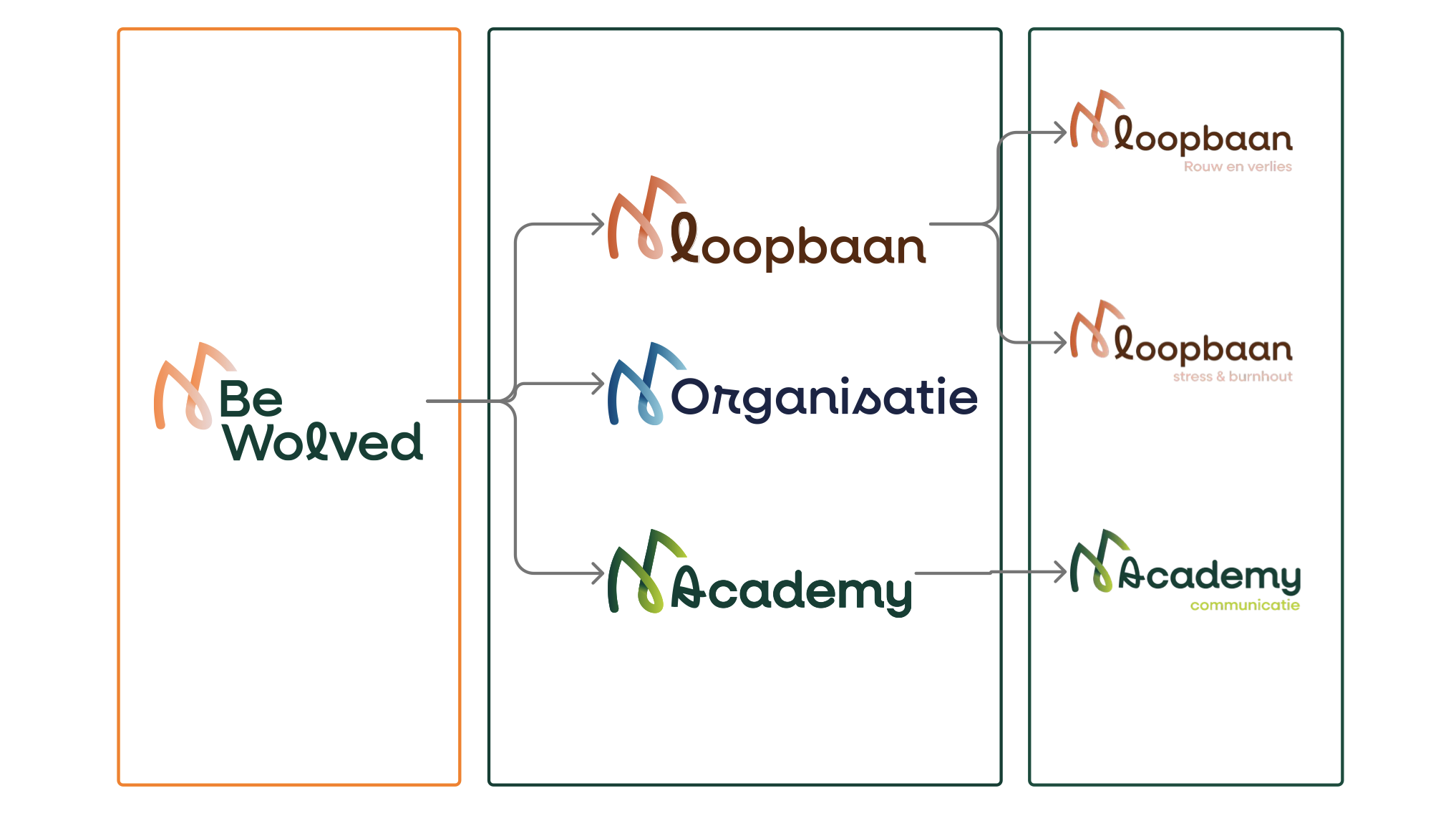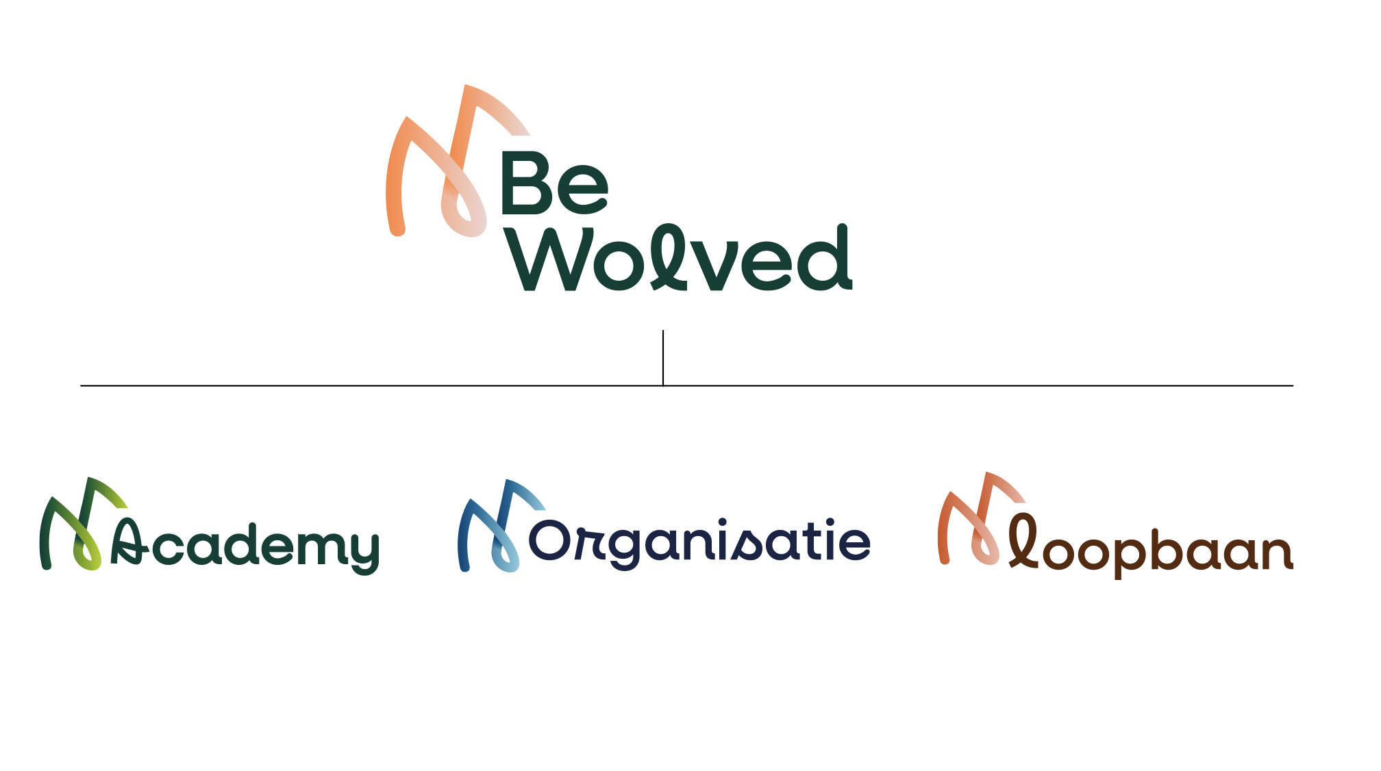 Het logo is opgebouwd uit drie niveaus, die elk een aparte tak binnen de merkstructuur representeren. Zo ontstaat er visuele én inhoudelijke helderheid, wat helpt om het brede aanbod van Bewolved logisch te ordenen.